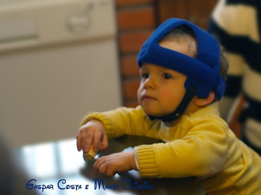 Moda? Não, é necessidade mesmo! Tal é velocidade atingida nas arrancadas atrás de uma bola, ou para apanhar uma porta aberta que muitas vezes pequenos acidentes acontecem. Depois fica a testa de todas as cores possíveis e imaginárias e os avós hiper preocupados. E entre investir uns cobres num capacete destes bem fofinhos, ou gastá-lo em Hirudoid, talvez não seja má ideia optar pela prevenção. É incómodo? Nem por isso... estranha-se um pouco ao príncipio, mas depois ninguém dá per ela, nem quem usa, nem quem vê. E é uma alívio e um sossego enormes.